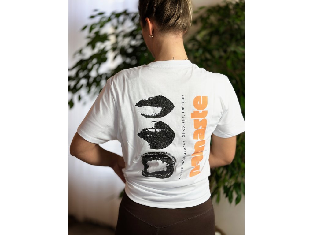 Motiv s nápisem „My lips during asanas" propojuje nadhled v průběhu jógové praxe. Vynosíte jej ve volném čase, během svých cest a díky své lehkosti je vhodné i na jógu.